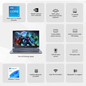 Designed for clarity and speed, the Acer ALG features a vibrant 15.6″ Full HD display that brings content to life with sharp details and vivid colors. Coupled with a generous 16GB of high-speed RAM and a rapid 512GB NVMe SSD, you’ll enjoy swift boot-ups, lightning-fast application launches, and ample space for all your essential files and media.